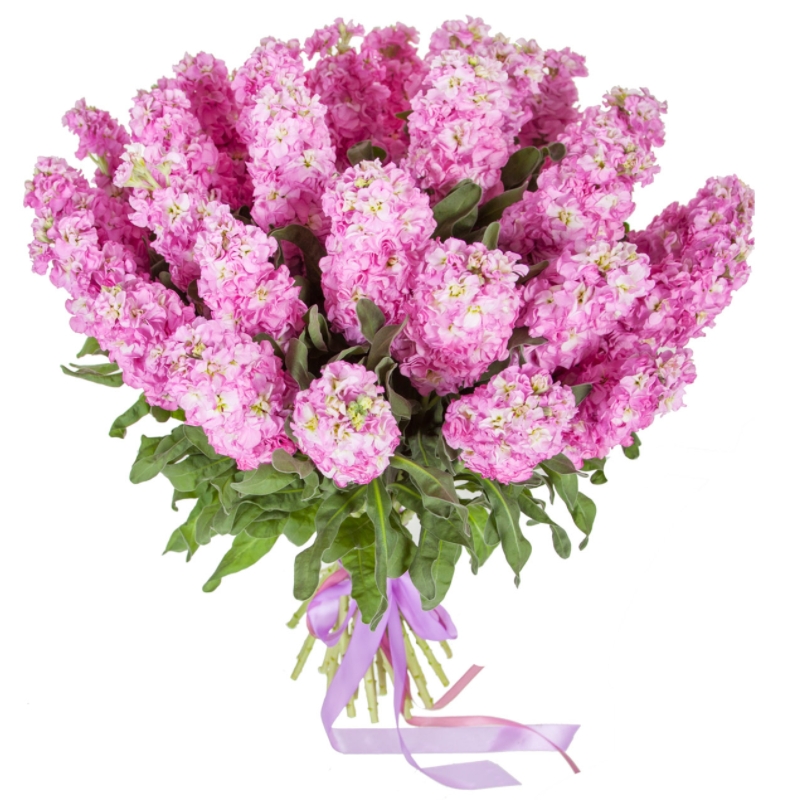 Букет состоит из 27 розовых маттиол, прозрачная упаковка, атласная лента.