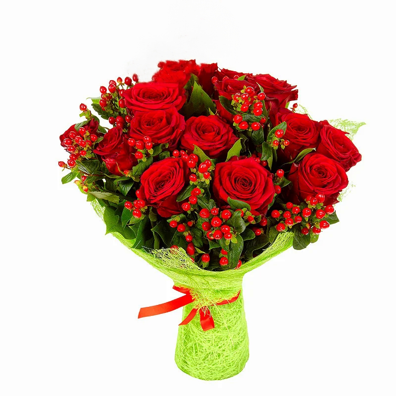 Букет состоит из 15 красных роз, 11 гиперикум, сизаль, атласная лента.