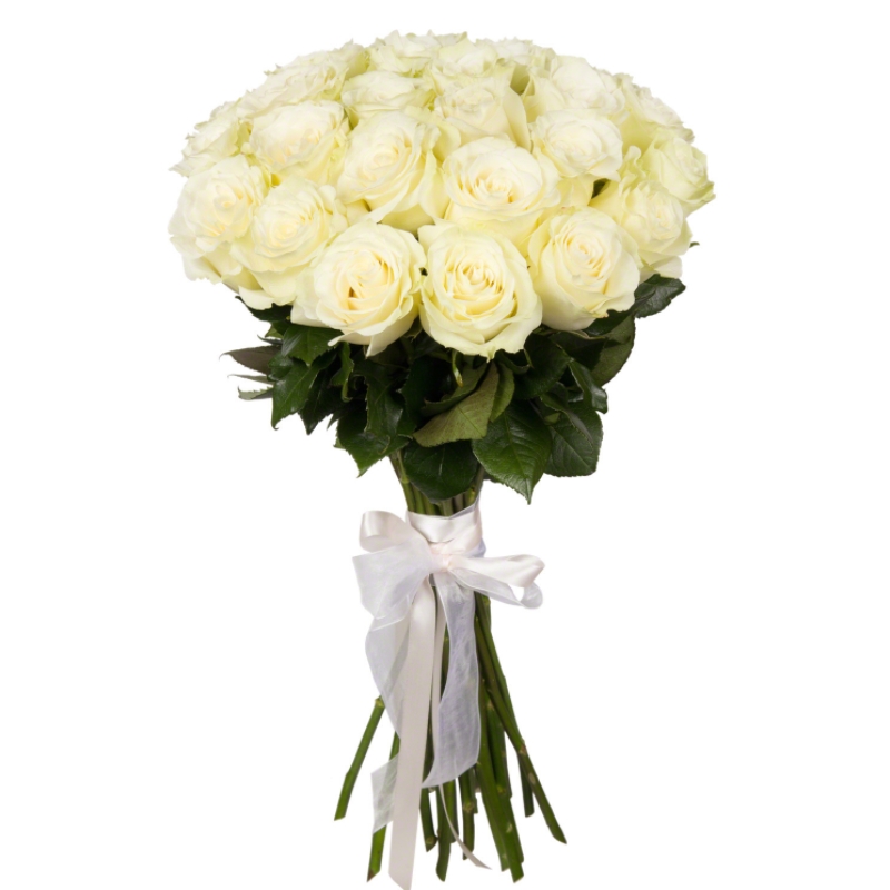 Букет состоит из 21 белая роза, прозрачная упаковка, атласная лента.