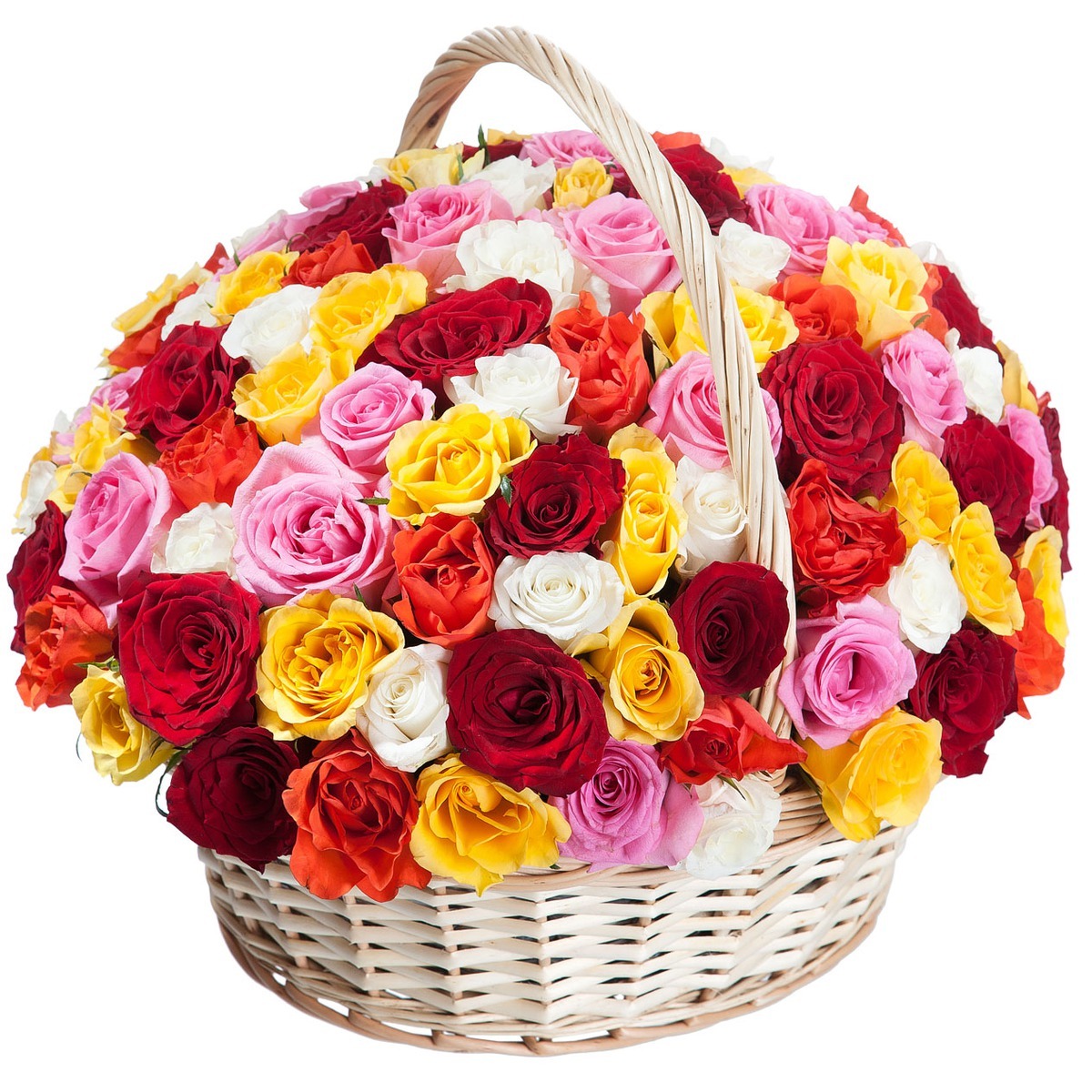 Букет состоит из MIX из 101 розовой / красной / белой / желтой и оранжевой розы, корзина.