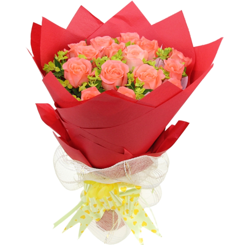 Букет состоит из 17 коралловых роз, зелень, красивая упаковка, атласная лента.
